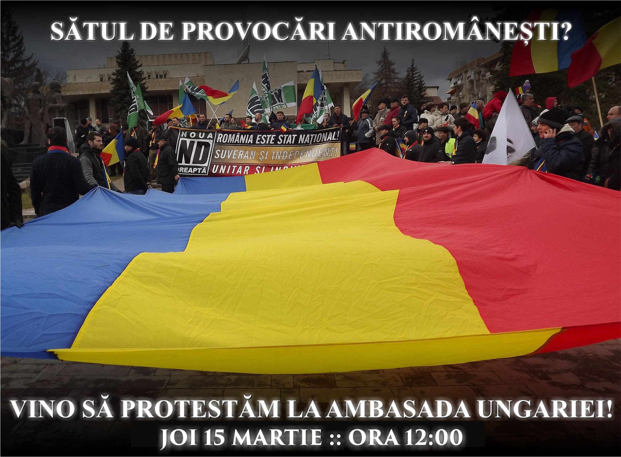 Față de aceste provocări dar și față de proiectul legislativ privind Statutul de autonomie al așa-zisului “ținut secuiesc”, susținut de Budapesta și depus la Parlamentul României de deputatul UDMR Kulcsar Terza Jozsef (care în prealabil a efectuat o vizită de „documentare” în Găgăuzia), vom protesta joi 15 martie începând cu ora 12:00 sub deviza: ÎMPOTRIVA SEPARATISMULUI MAGHIAR, PENTRU UNITATE NAȚIONALĂ!