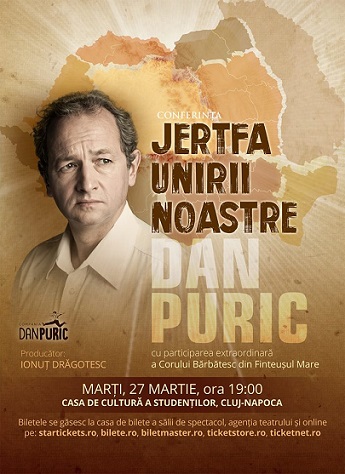 Marți 27 martie la ora 19:00, la Casa de Cultură a Studenților din Cluj-Napoca, va avea loc conferința lui Dan Puric intitulată „Jertfa Unirii Noastre”, cu participarea extraordinară a Corului Bărbătesc din Finteusul Mare!