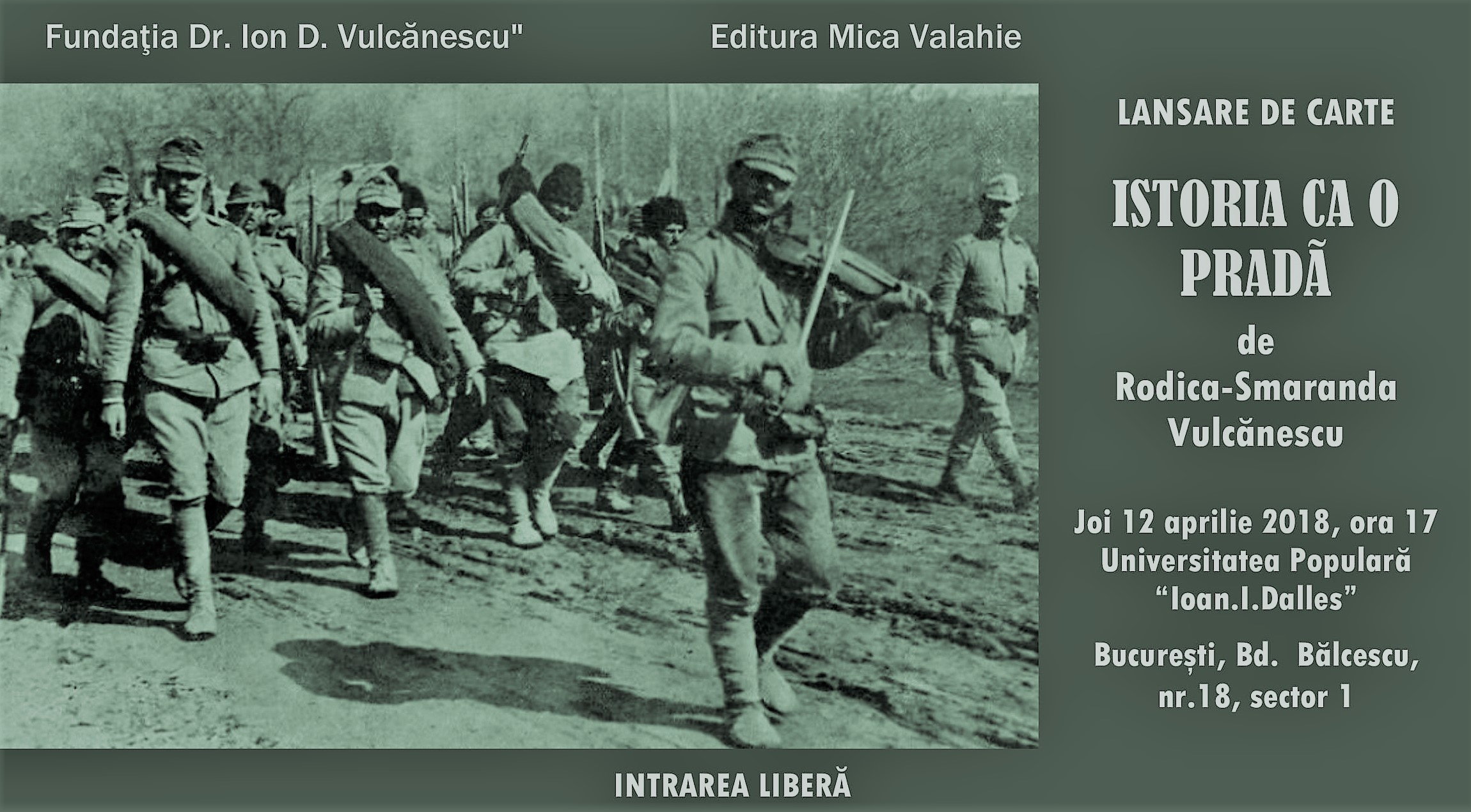 SocialUltimele ştiri LANSARE DE CARTE: „Istoria ca o pradă” de Rodica Smaranda Vulcănescu By On apr. 10, 2018 0 713 Share Fundația Dr. Ion Vulcănescu împreună cu Editura Mica Valahie organizează lansarea cărții ISTORIA CA O PRADĂ de Rodica-Smaranda Vulcănescu, joi, 12 aprilie 2018, ora 17, la sala Dalles din București. Intrarea liberă. 0 713 Share Facebook