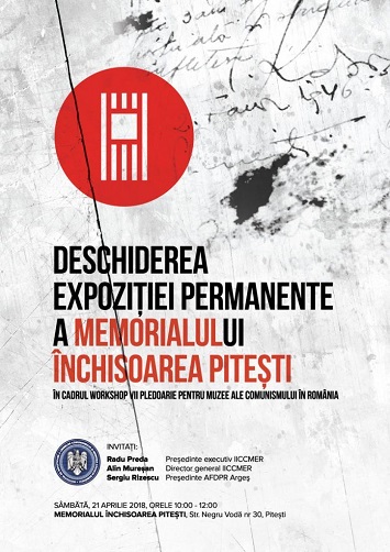 Sâmbătă, 21 aprilie 2018, în cadrul Worskop VII Pledoarie pentru Muzee ale Comunismului în România, se va deschide expoziția permanentă a Memorialului Închisoarea Pitești. Evenimentul va avea loc între orele 10.00-12.00, la Memorialul Închisoarea Pitești (Str. Negru Vodă, nr. 30).