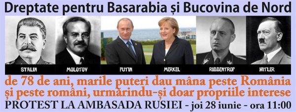 Noua Dreaptă va organiza proteste mâine în fața ambasadelor Rusiei de la București și Chișinău, pentru a cere DREPTATE PENTRU BASARABIA ȘI BUCOVINA DE NORD și retragerea trupelor ruse de ocupație de pe teritoriul Republicii Moldova.