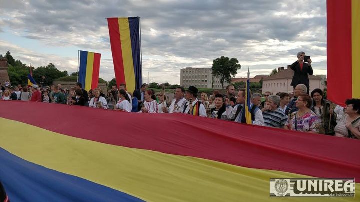 Marșul Centenarului – Tricolor de 100 de metri întins în fața Catedralei Reîntregirii. Flacăra Unirii, aprinsă la Alba Iulia, a plecat spre Chișinău