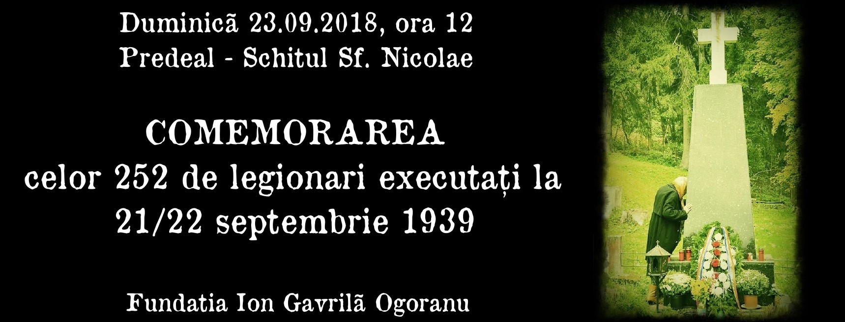 Duminică 23 septembrie 2018, ne vom întâlni la Predeal, pentru a comemora cei 252 de legionari executați sumar în noaptea de 21-22 septembrie 1939, pe tot cuprinsul țării, și reînhumați în 1940 la cimitirul de la schitul Sf Nicolae.