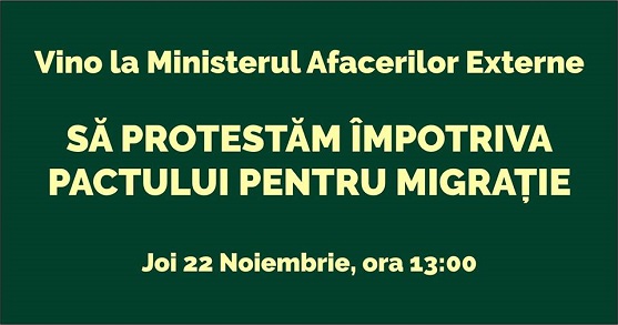 Joi 22 noiembrie vă invităm să manifestăm la ora 13:00 în fața Ministerului Afacerilor Externe pentru respingerea Pactului Global pentru Migrație ce urmează să fie parafat pe 10-11 decembrie 2018, în cadrul reuniunii ONU de la Marrakesh (Maroc).