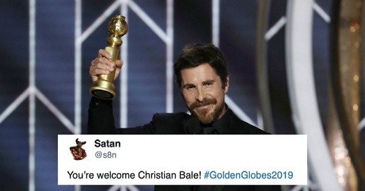„Mulțumesc, satana, pentru că mi-ai dat inspirație să joc acest rol…Ea (n.r. soţia lui) știe ce prostii pot să scot pe gură uneori. Pot să distrug perfect un film bun și o carieră cu un singur discurs. Așa că mulțumesc pentru acest sfat, dragostea mea”, a declarat Christian Bale la Globurile de Aur 2019.