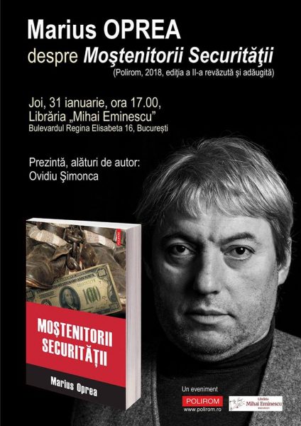 Joi, 31 ianuarie 2019, ora 17.00, la Librăria „Mihai Eminescu” (Bulevardul Regina Elisabeta 16, București), va avea loc lansarea volumului „Moștenitorii Securității”, de Marius Oprea, apărut de curând la Editura Polirom (ediția a II-a revăzută și adăugită).