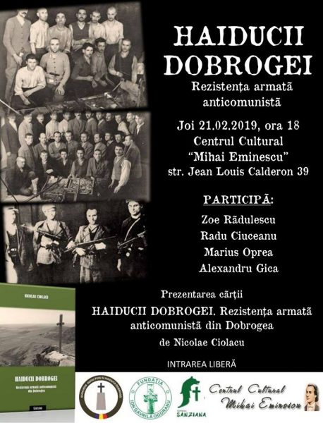 […] Eminescu de pe str. Jean Louis Calderon nr. 39, sector 2, București, la prezentarea cărții „HAIDUCII DOBROGEI. Rezistența armată anticomunistă din Dobrogea”, mărturie a ultimului lider al gherilelor dobrogene care a supraviețuit represiunii, Nicolae […]