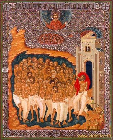 La asfinţitul soarelui, Sfinţii 40 de Mucenici au fost dezbrăcaţi de haine şi aruncaţi goi în lacul îngheţat al Sevastiei. Era ger cumplit şi se chinuiau de iuţimea frigului. Dar ei strigau la Dumnezeu să le dea putere şi răbdare până la sfârşit. Unii mai slabi strigau: „Iute este gerul”. Iar cei mai tari, răspundeau: „Dulce este raiul!” Alţii ziceau: „Rece este gheaţa!” Ceilalţi îi îmbărbătau, zicând: „Fierbinte este dragostea de Dumnezeu!” Şi aşa se întăreau unii pe alţii, luptându-se cu frigul şi durerea.