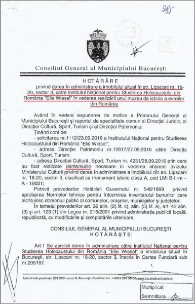 Deocamdată, consilierii din cadrul CGMB par să fi înţeles cît de importantă este decizia lor la şedinţa din 23 aprilie 2019, cînd Gabriela Firea vrea să propună pentru a treia oară cedarea clădirii către Institutul „Elie Wiesel” pentru acel Muzeu al Holocaustului, pe care l-a promis Klaus Iohannis încă din 2016.