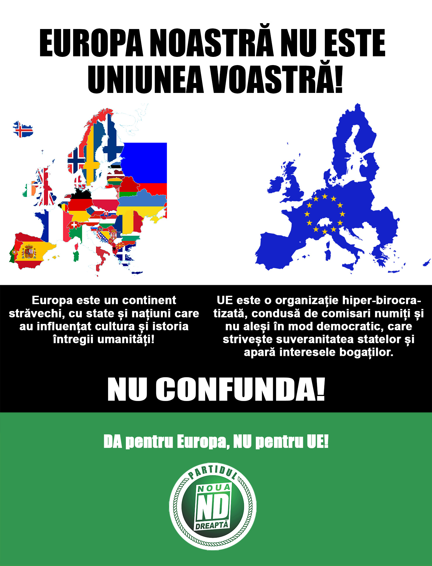 Naționaliștii români nu participă la campania pentru alegerile europene din 26 mai și resping ferm actuala Uniune Europeană hiper-birocratizată, condusă de comisari numiți și nu aleși în mod democratic, care strivește suveranitatea statelor și apără interesele corporațiilor. Această Uniune Europeană nu trebuie confundată cu adevarata Europă: a patriilor și națiunilor multi milenare, care au marcat cultura și istoria întregii umanități și care au capacitatea să o facă în continuare!