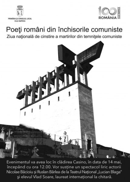 Primăria Cluj-Napoca organizează un spectacol liric, intitulat „Poeţi români din temniţele comuniste” în clădirea Casino din Parcul Central, în data de 14 mai a.c., ora 12.00, la care vor participa actorii Nicolae Băcioiu şi Ruslan Bârlea de la Teatrul Naţional „Lucian Blaga” şi elevul, laureat internaţional la chitară clasică, Vlad Soare de la Colegiul de muzică „Sigismund Toduţă”.