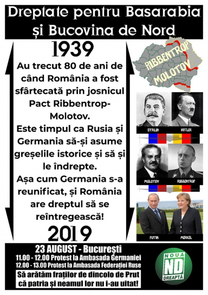 Noua Dreaptă protestează vineri 23 August a.c. față de răpirea Basarabiei, Bucovinei de Nord și a ținutului Herța de către Uniunea Sovietică, ca o consecință directă a Pactului ruso-german Molotov-Ribbentrop încheiat la 23 August 1939, pact reactualizat și întărit în ultimii ani prin declarațiile cancelarului german Angela Merkel și ale președintelui rus Vladimir Putin.