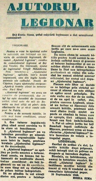 …Circulara mea cu înfiintarea „Ajutorului Legionar” a aparut în 26 Septembrie 1940. Dupa ce explicam rostul acestei organizatii, în tragicele împrejurari pe care le traieste țara, încheiam circulara cu urmatorul apel: „Legionari, cuvântul de ordine s-a dat. La prima batalie dupa prigoana, ochii întregii tari va privesc cu dragoste si încredere deplina. Biruinta, ca întotdeauna, sta numai în hotarârea voastra. Ridicati „Ajutorul Legionar” la înaltimea marilor bătălii din trecut și veți fi vrednici de recunostinta întregului popor”. În aceeasi circulara l-am numit pe Ilie Gârneata, Comandant al Bunei Vestiri, conducator al noii organizatii. În modul acesta, în afara de rostul primordial al noii institutii, crearea „Ajutorului Legionar” mai avea avantajul ca îi oferea o compensație lui Ilie Gârneata, mâhnit pentru absenta lui din guvern. „Ajutorul Legionar” a luat în cursul guvernării noastre o dezvoltare asa de mare încât putea fi echivalat unui minister.