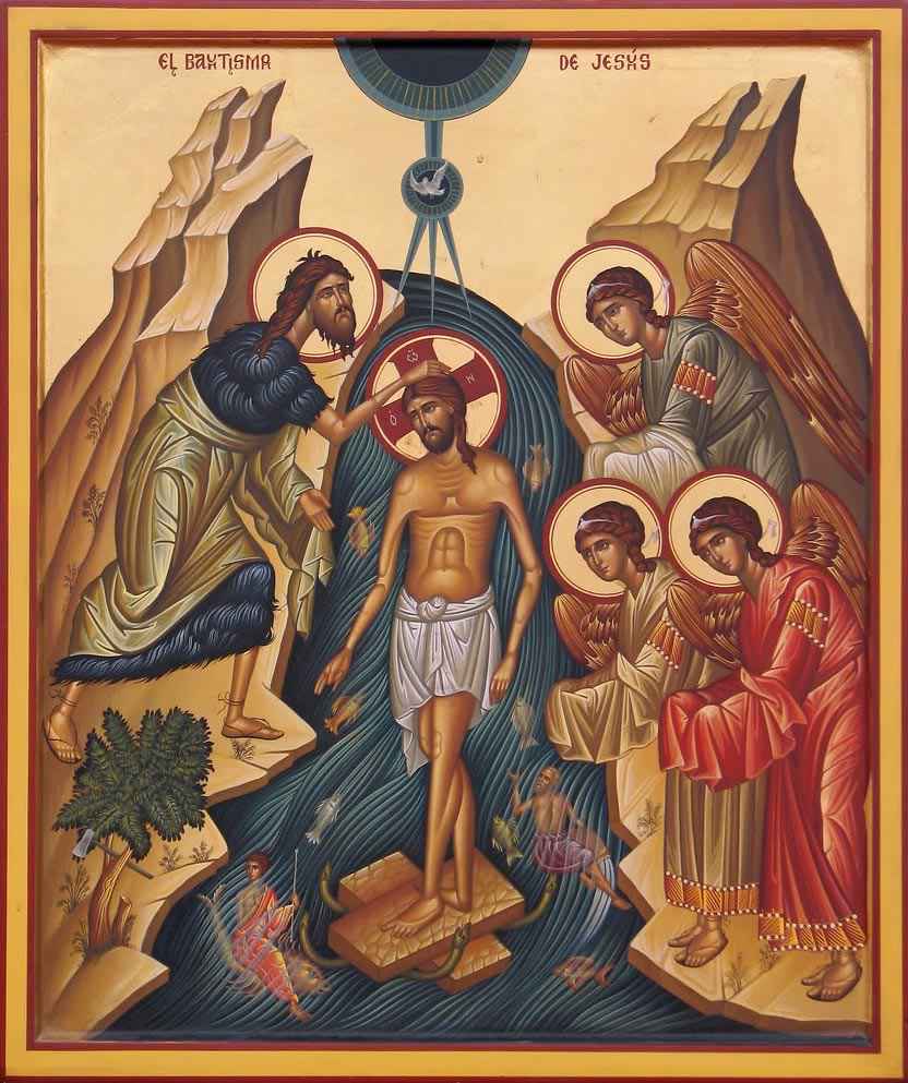 „In vremea aceea – zice dumnezeiescul Evanghelist Marcu, ucenic al Sfantului Apostol Petru care era de fata cand s-a petrecut acest fapt dumnezeiesc – a venit Iisus din Nazaretul Galileii si s-a botezat in Iordan, de la Ioan. Si indata (in aceeasi clipa) iesind din apa, a vazut Ioan cerurile deschise si Duhul Sfant ca un porumbel pogorandu-Se peste Dansul.
