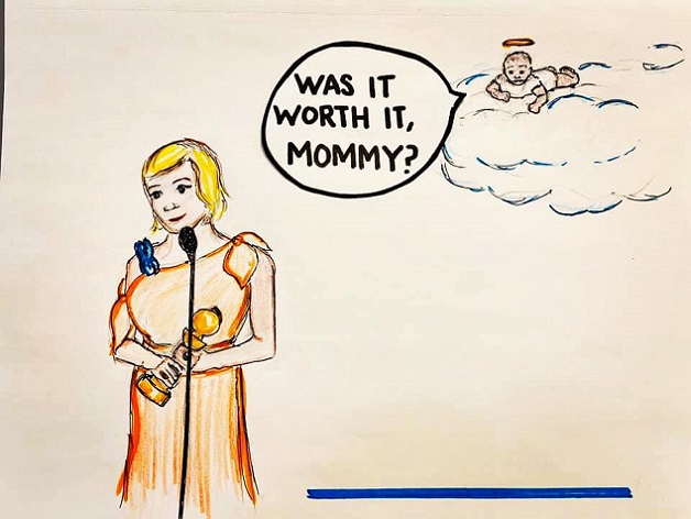 Actrița spusese că premiul primit se datorează faptului că a făcut un avort pentru a se concentra mai bine pe cariera sa artistică. Laura Klassen a postat o fotografie cu actrița pe scena ceremoniei, lângă care a adăugat umbra unui copilaș, prezent însă doar ca amintire. Montajul foto (sus) este însoțit de întrebarea: „A meritat?”.