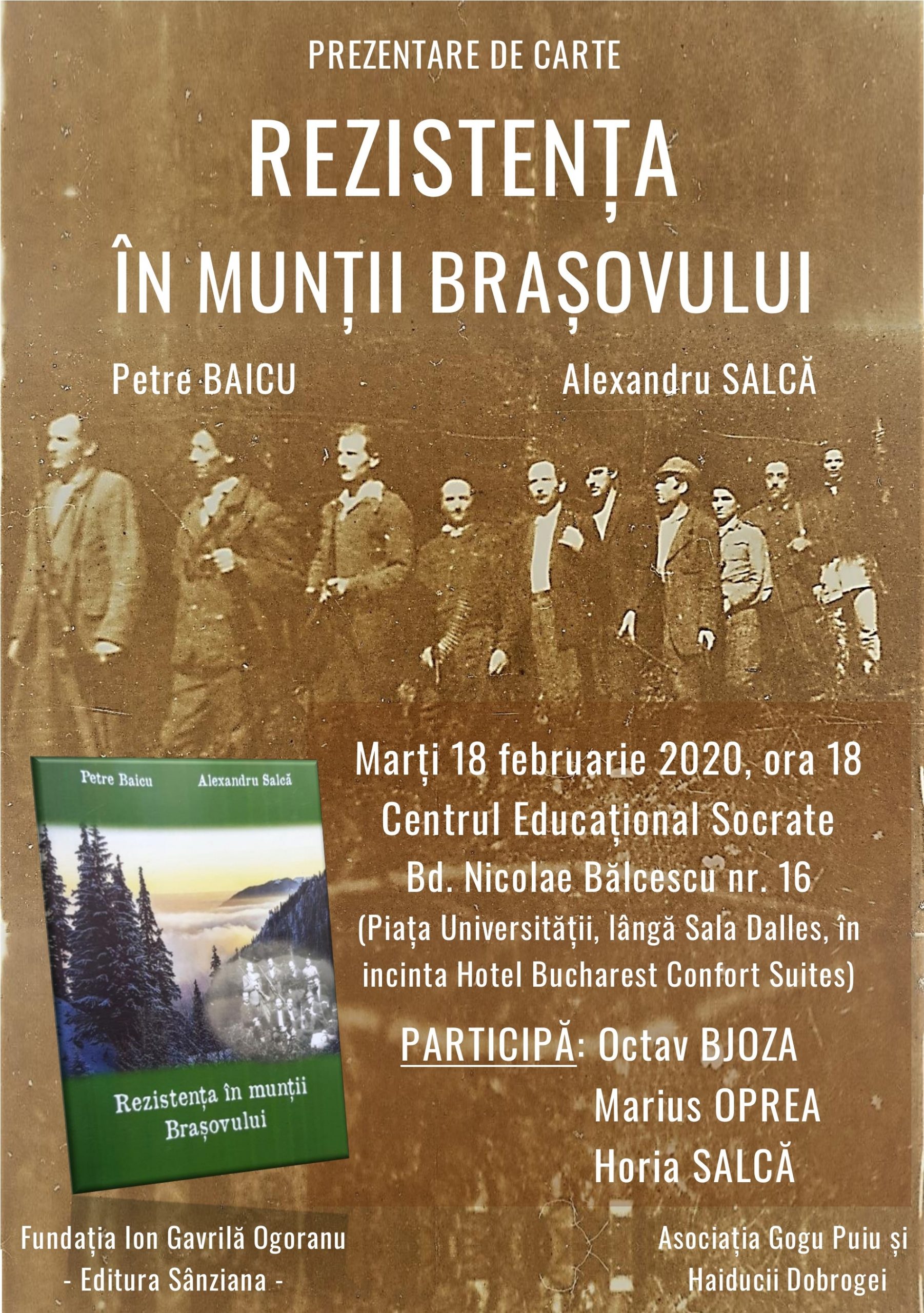 Vă invităm Marți 18 februarie 2020, ora 18, la Centrul Educațional Socrate, bd. Nicolae Bălcescu nr. 16, sector 1, București (în incinta Hotel Bucharest Confort Suites, lângă Sala Dalles), la prezentarea cărții REZISTENȚA ÎN MUNȚII BRAȘOVULUI, având ca autori pe doi dintre protagoniștii luptei anticomuniste din orașul de sub Tâmpa – foștii deținuți politici Petre Baicu și Alexandru Salcă. O evocare dramatică a primelor acțiuni de organizare a rezistenței împotriva ocupației sovietice și regimului comunist, imediat după 1944.
