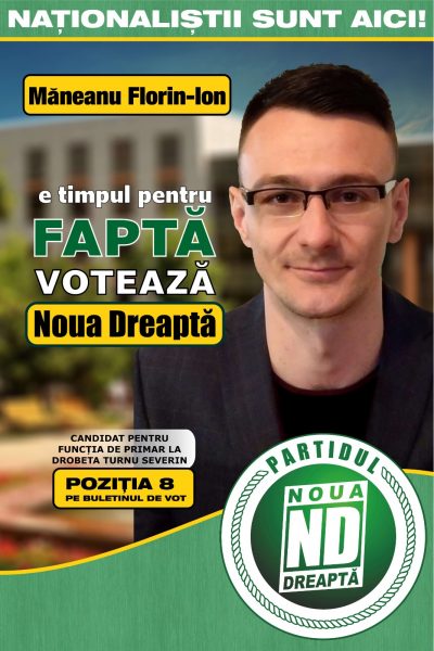 Dorim succes tuturor candidaților Partidului Noua Dreaptă care luptă pentru ocuparea locurilor în consiliile locale, județene, precum și la primării! Suntem alaturi de ei și îndemnăm pe toți românii să le acorde votul. Pentru o Românie românească si creștină, pentru Familie, Credință și Dreptate!