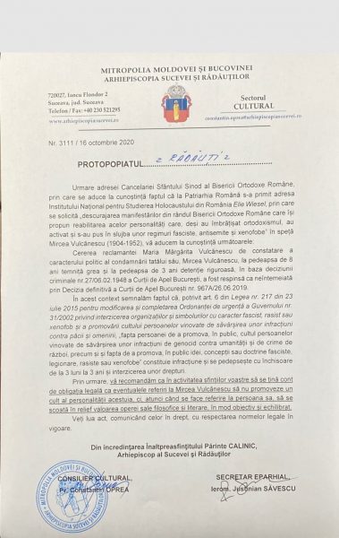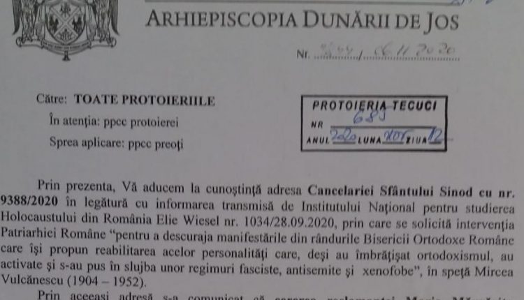 Din mai multe unități administrative ale Bisericii Ortodoxe Române sosesc adrese emise de mitropolii și arhiepiscopii, în care se prelucrează o adresă a Institutului Național pentru Studiul Holocaustului în România “Elie Wiesel” (INSHR-EW). Acesta solicită intervenția Patriarhiei Române pentru “a descuraja manifestările din rândurile Bisericii Ortodoxe Române care își propun reabilitarea acelor personalități care, desi au îmbrățișat ortodoxismul, au activat și s-au pus în slujba unor regimuri fasciste, antisemite sau xenofobe”, făcându-se referire în mod expres la Mircea Vulcănescu, martirizat în temnița Aiudului în 195 .