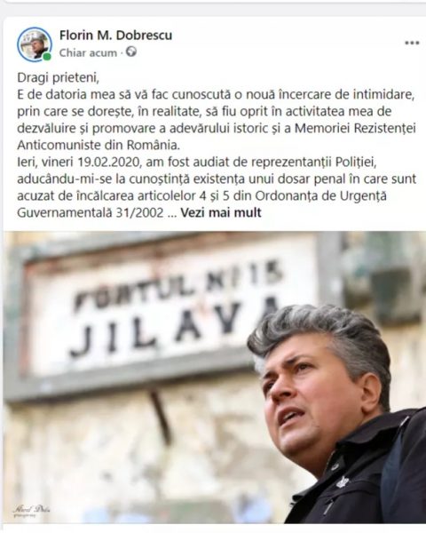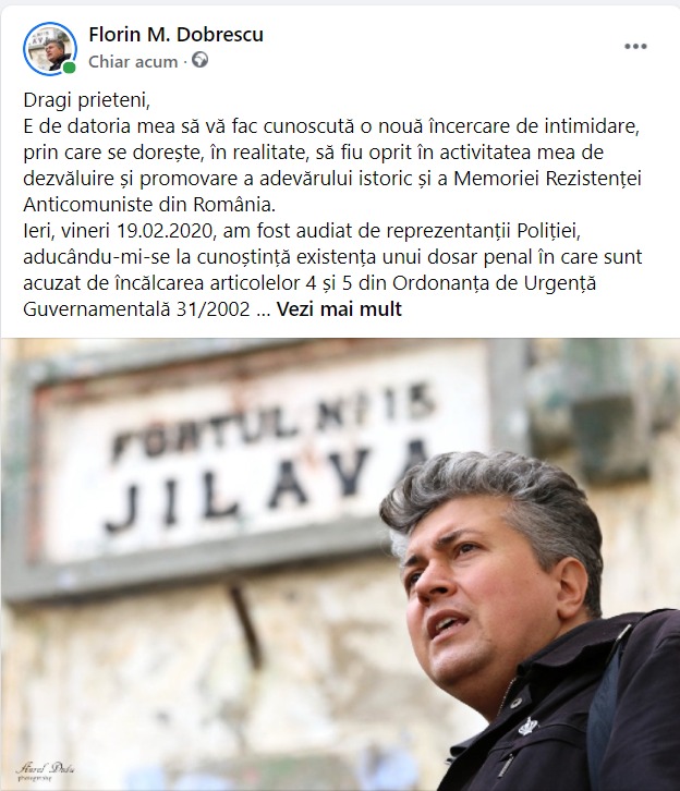 E de datoria mea să vă fac cunoscută o nouă încercare de intimidare, prin care se dorește, în realitate, să fiu oprit în activitatea mea de dezvăluire și promovare a adevărului istoric și a Memoriei Rezistenței Anticomuniste din România.