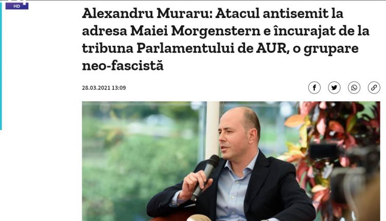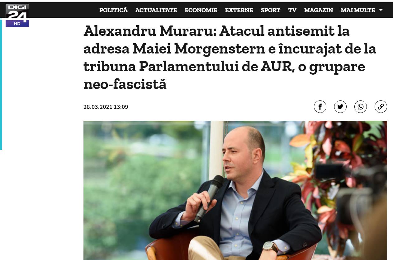 Că avem de-a face cu o diversiune, o dovedește însăși intervenția imediată a consilierului onorific al premierului Cîțu, cel care a ordonat și mazilirea președintelui AFDPR Octav Bjoza. Alexandru Muraru, fratele geamăn al consilierului prezidențial Andrei Muraru, a declarat imediat că: „Atacul antisemit la adresa Maiei Morgenstern e încurajat de la tribuna Parlamentului de AUR, o grupare neo-fascistă”. (Digi24)