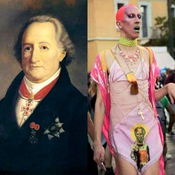 În stânga: Goethe – homosexual, ilustru gânditor german și om de știință, unul dintre slujitorii culturii universale.