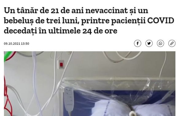 Grupul de Comunicare Strategică (GCS) a anunțat sâmbătă, 9 octombrie, că printre decesele înregistrate se numără și cel al unui tânăr de 21 de ani, nevaccinat, din județul Sibiu.