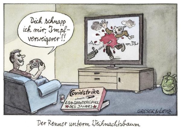 Mă uit la fotografiile de la știri cu polițiști înarmați, mascați, îmbrăcați în negru, care opresc oamenii pe străzi pentru a le cere actele digitale și citesc poveștile altora care au fost arestați pentru că și-au părăsit casa mai mult de o data pe zi – cât este permis – și îi aud pe politicienii austrieci declarând că cei care refuză să-şi facă injecția trebuie să fie ocoliți și transformaţi în țapi ispășitori până când vor accepta. Apoi mă uit la interviuri cu „oameni obișnuiți” și aceştia spun că cei „nevaxaţi” o căutau cu lumânarea. Unii dintre ei spun că toți ar trebui închiși, acești dușmani ai poporului. În cel mai bun caz, „anti-vaxxerii” sunt paranoici și dezinformați. În cel mai rău caz, sunt rău intenționați și ar trebui pedepsiți.Câteva zile mai târziu, mă mai trezesc cu câteva știri despre Austria: de anul viitor, toată lumea din țară va avea parte de un vaccin covid introdus în ei cu forţa de către stat, trecând peste dreptul lor la ceea ce anumiți oameni, care în ultima vreme au devenit extrem de tăcuţi, numeau „autonomie corporală”.Apoi mă uit peste graniță la Germania. Văd că, în Germania, politicienii iau în considerare și internarea „ezitantului vizavi de vaccinare” și, de asemenea, au fost de acord recent să impună vaccinarea fiecărui cetățean. Până la sfârșitul iernii, spune înviorător de sincerul ministru al sănătății german, nemţii vor fi „vaccinați, vindecați sau morți”. Se pare că nu există a patra opțiune.Au fost ocupați în Germania. Recent au pus garduri în unele orașe pentru a-i separa pe nevaccinaţii cei rău de vaccinaţii cei buni la târgurile de Crăciun. În aer liber. Poate că vor oferi celor buni și pietre pe care să le arunce peste acele garduri. Când văd caricaturi ca cea din partea de sus a acestei pagini, care a apărut recent într-un ziar german cunoscut, cred că acea situaţie nu e prea îndepărtată. Aici, bărbatul de pe canapea și-a cumpărat un joc cu împușcături cu care se poate distra ucigând oameni nevaccinati. Va fi, spune caricaturistul, „o lovitură de succes sub bradul de Crăciun.”
