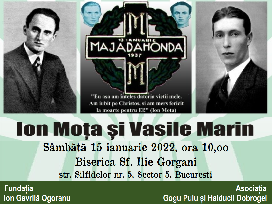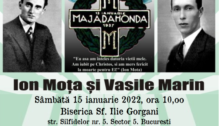 Sâmbătă 15 ianuarie 2022, va avea loc la biserica Sf Ilie Gorgani din Bucureşti o slujbă religioasă (Sfânta Liturghie de la ora 9 și parastas de la ora 10) pentru pomenirea lui Ioan I. Moţa şi Vasile Marin, comandanţi legionari căzuţi în 1937 în Spania, la Majadahonda, pe frontul apărării Madridului în faţa asaltului armatelor comuniste care distrugeau civilizaţia creştină spaniolă, încercând să constituie – cu sprijinul sovieticilor – un capăt de pod al Comunismului în extremitatea vestică a continentului, anunţă Fundaţia Ion Gavrilă Ogoranu.