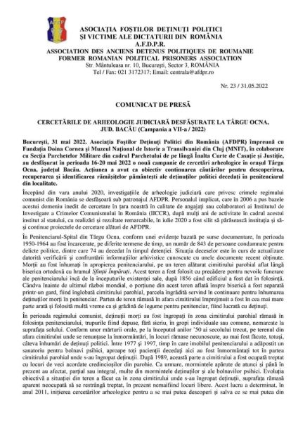 București, 31 mai 2022. Asociația Foștilor Deținuți Politici din România (AFDPR) împreună cu Fundația Doina Cornea și Muzeul Național de Istorie a Transilvaniei din Cluj (MNIT), în colaborare cu Secția Parchetelor Militare din cadrul Parchetului de pe lângă Înalta Curte de Casație și Justiție, au desfăşurat în perioada 16-20 mai 2022 o nouă campanie de cercetări arheologice în orașul Târgu Ocna, județul Bacău. Acţiunea a avut ca obiectiv continuarea căutărilor pentru descoperirea, recuperarea și identificarea rămăşiţelor pământeşti ale deţinuţilor politici decedaţi în penitenciarul din localitate.