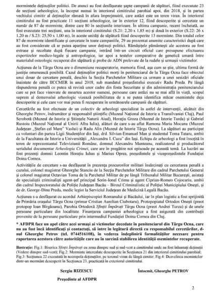- AFDPR face un apel către acei urmași ai victimelor decedate în penitenciarul din Târgu Ocna, care nu au fost încă identificați și contactați, să intre în legătură directă cu responsabilul cercetărilor, d-nul Gheorghe Petrov (tel. 0744516108), în vederea îndeplinirii formalităților necesare pentru raportarea acestora către autoritățile care au în sarcină stabilirea identității osemintelor recuperate.