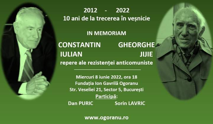 Constantin Iulian și Gheorghe Jijie, liderii Federației Române a Foștilor Deținuți Politici – Luptători Anticomuniști vor fi comemorați miercuri 8 iunie 2022, începând cu ora 18, la sediul Fundației Ion Gavrilă Ogoranu din str. Veseliei nr. 21, Sector 5, București. Vor participa Dan Puric și Sorin Lavric. Vor fi vizionate înregistrări video inedite de la începutul anilor 1990.