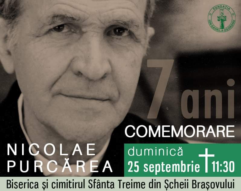 Au trecut șapte ani de când Nicolae Purcărea a întregit șirul martorilor incomozi ai istoriei comunismului care s-au ascuns în lumina Celui Nepătruns. Pe cei care ați avut șansa de a-l cunoaște și pe cei care nu ati avut-o, dar aveți o sensibilitate pentru destinul neamului românesc și pentru valorile creștine, vă anunțăm că anul acesta comemorarea mărturisitorului șcheian va avea loc duminică, 25 septembrie, ora 11:30, la Biserica Sfânta Treime – Tocile.