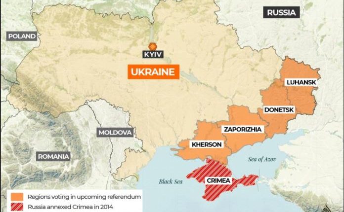 Acestea sunt primele două regiuni ucrainene care au votat în favoarea anexării de către Rusia de la începutul ofensivei ruse în Ucraina, pe 24 februarie.