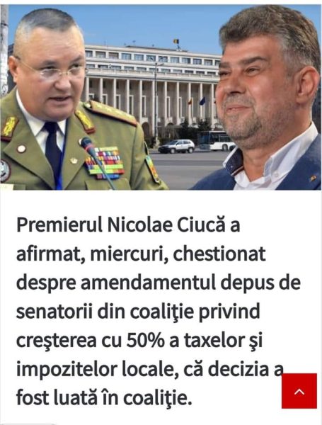Premierul Nicolae Ciucă a afirmat, întrebat în legătură cu amendamentul depus de senatorii din coaliţia de guvernare privind majorarea cu 50% a taxelor şi impozitelor locale, că decizia a fost luată în coaliţie, menţionând că varianta privind stabilirea acestor impozite după grilele notariale a fost amânată, după ce autorităţile locale au atenţionat că acest lucru era imposibil de realizat până la sfârşitul anului.