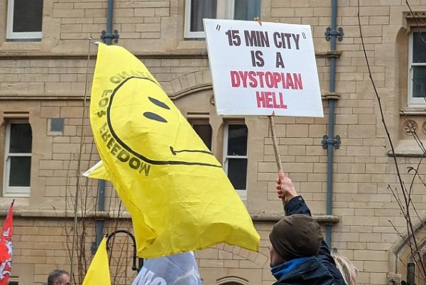 Propunerile recente privind așa-numitele „Orașe de 15 minute” au stârnit numeroase critici în întreaga lume, inclusiv în orașe precum Oxford, unde urmează să aibă loc teste pilot (foto protest mai sus).