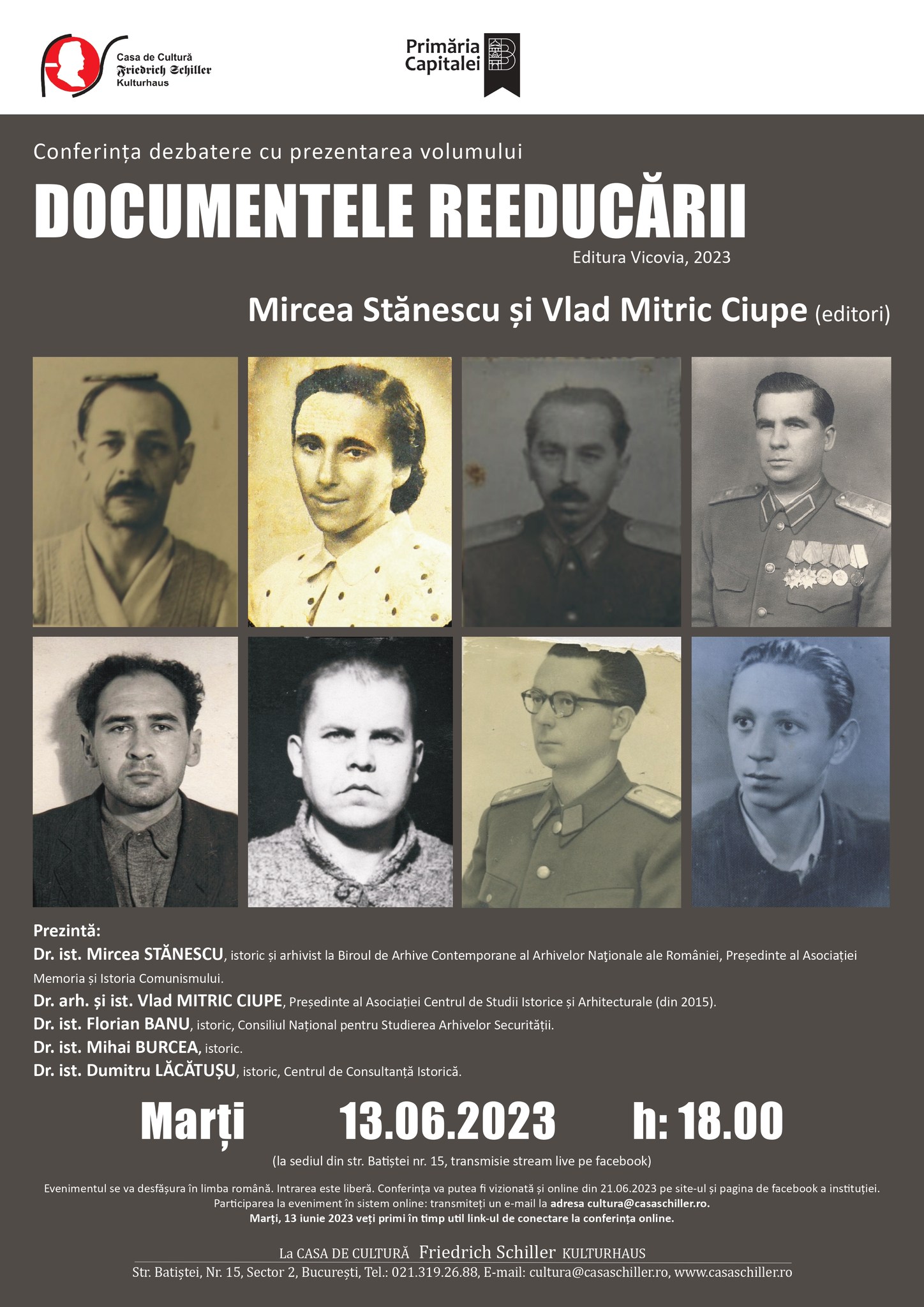 Evenimentul va fi transmis și online prin intermediul platformei Zoom. Pentru participare în sistem online: transmiteți un e-mail la adresa cultura@casaschiller.ro. Marți, 13 iunie 2023, veți primi în timp util link-ul pentru conectare online. Înregistrarea video a conferinței va putea fi vizionată din 21 iunie 2023 pe site-ul și pagina de Facebook a instituției.