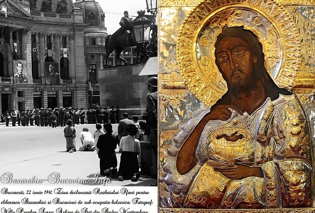La stânga avem modul cum a reacționat poporul român la anunțul dat de oficialități privind declanșarea războiului pentru recuperarea pământului sfânt al Basarabiei și Bucovinei, moment fotografiat în Piața Palatului de cunoscutul fotograf german iubitor al României Willy Pragher (1908 – 1992) iar la dreapta Icoana Sfântului Ioan Botezătorul, cu care au plecat la luptă oștirile conducătorului Ion Antonescu în Războiul Sfânt, icoană care a fost salvată și apoi donată Bisericii Sfântul Ștefan – Călărași din București, , cu pete de sânge în lemnul ei, după cum ne arată părintele paroh Constantin Cârlan Ungureanu (foto dreapta).