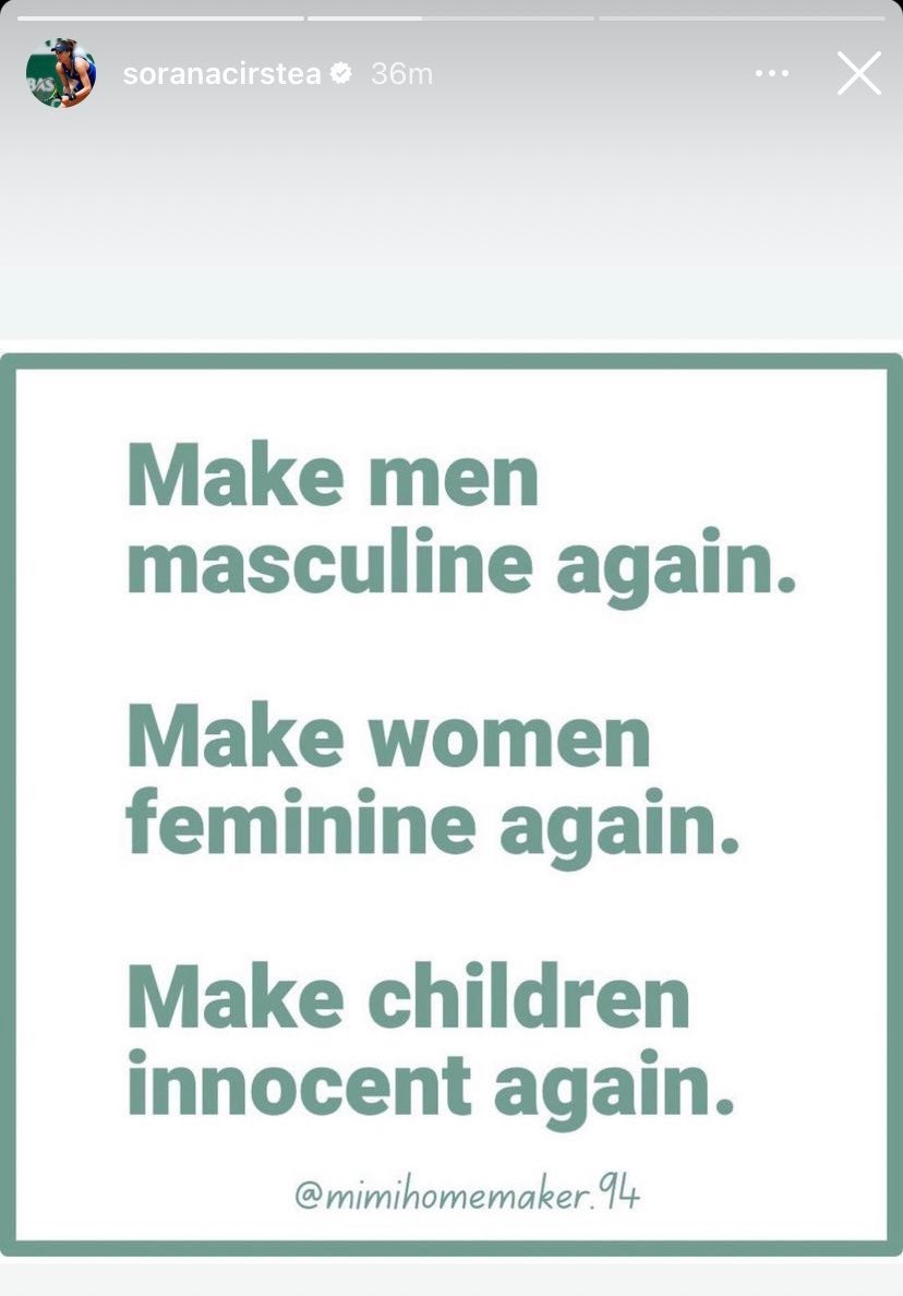 SORANA Cîrstea a dezvăluit că preferă valorile tradiționale: „Faceți bărbații din nou masculini, fetele din nou feminine și copiii din nou inocenți”, a scris Cîrstea, exprimându-și nemulțumirea față de schimbările sociale.