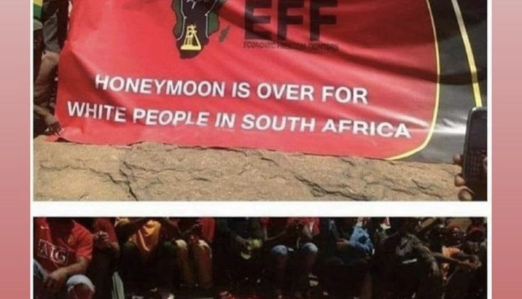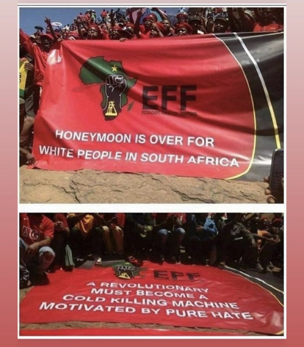 Bannere ale membrilor sud-africani ai stângii radicale cu mesaje incitatoare: „Luna de miere pentru albi s-a terminat în Africa de Sud” și un citat din Che Guevara: „Un revolutionar trebuie să devina o mașina de ucis cu sânge rece motivat de ura pură.”