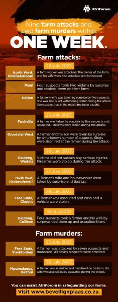 La 1 august, o victimă în vârstă a fost ucisă în Biesiesvlei, provincia de Nord-Vest, după ce ușa de la intrare a fost spartă, potrivit purtătorului de cuvânt al securității Afriforum, Jacques Broodryk. Au fost 9 atacuri la ferme și 2 crime între 22 și 30 iulie, a spus Broodryk.