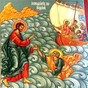 Domnul însă i-a liniştit pe apostoli prin cuvintele: Îndrăzniţi! Eu sînt, nu vă temeţi! Petru atunci, cuprins de îndoială, s-a rugat, zicînd: „Doamne, dacă eşti Tu, porunceşte-mi să vin la Tine pe apă!” „Vino!” i-a răspuns Domnul. Dar pe cînd mergea el pe valuri către Hristos, „văzînd vîntul cel tare”, s-a biruit de frică şi îndoială şi a început a se afunda. În clipa aceea a strigat: „Doamne, mîntuieşte-mă!” Iar Domnul l-a apucat de mînă şi l-a mustrat: Puţin credinciosule, pentru ce te-ai îndoit? (Matei 14, 30-31).