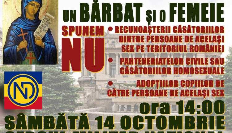 „Pe 14 octombrie, la ora 14, mă voi afla alături de cei ce vor protesta, în fața Cercului Militar din București, împotriva implementării agendei propagandei homosexuale. Așa cum am spus și cu alte ocazii, nu împotriva unor oameni, nu împotriva homosexualilor ori a victimelor oricărui fel de deviații, ci împotriva unei ideologii promovate de cercuri ale stângii neomarxiste, al căror singur scop nu este acela de a apăra drepturile cuiva, ci de a distruge ireversibil toate fundamentele culturale ale societății tradiționale europene. E datoria noastră de creștini să nu urâm oamenii, indiferent de viciile sau păcatele cărora le sunt victime, ci să urâm păcatul și folosirea acestuia ca armă politică. Folosind o recentă sentință a CEDO, care în sine nici nu obligă România să aducă modificări legislative la nivelul conceptului căsătoriei și familiei (așa cum intenționat eronat prezintă lucrurile propaganda LGBT), adepții unui comunism abil camuflat sub ambalajul apărării drepturilor minorităților încearcă să pună presiune, șantajând instituțiile statului român. Protestul Noii Drepte este autorizat de Primăria Capitalei și se va desfășura, la aceeași oră cu protestul activiștilor propagandei LGBT, la o distanță de doar câteva sute de metri de acesta. Cred că este o îndatorire a tuturor celor care înțeleg că în România sunt respectate drepturile acestei comunități, nefiind vorba de fapt decât de o măsură menită să lovească în așezarea tradițională a României, precum și că opoziția față de o asemenea cerere este un act de mărturisire, mai ales într-o zi ca aceea a praznicului Sf Cuvioase Parascheva. De aceea, fac apel la toți creștinii din București ca sâmbătă să participe, dimineață, la Sf. Liturghie ce se va oficia în toate bisericile, iar la ora 14 să vină în Fața Cercului Militar, pentru a mărturisi în favoarea unei Românii creștine. Să protestăm pașnic, evitând orice violență sau răspunsul la orice fel de provocări sau agresiuni. „Fără violență!” a fost una din lozincile Revoluției din Decembrie 1989. Și ea este la fel de valabilă ca atunci. Dumnezeu să ajute națiunii române!