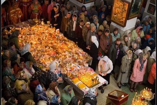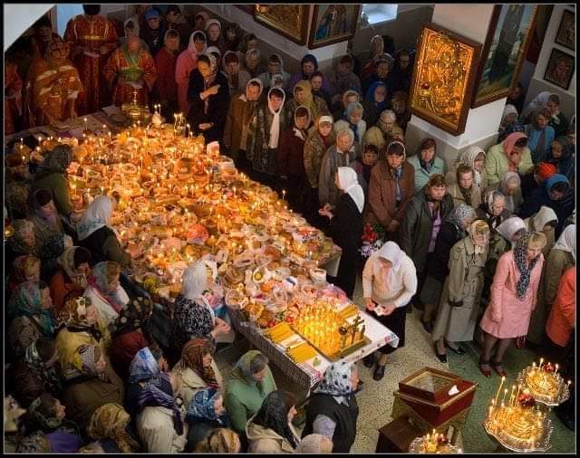 Se risipesc prin Biserică ca nişte furnici, aşezând darurile pe mesele grele de lemn putred. Foşgăie pungile, abia mijind prin fiinţă, se fâţâie de colo până colo, aşteptând, aprinzând lumânări pe colivă şi pe pachetele de bunătăţi. Ici colo câte un oftat, şi o amintire despre bărbatul plecat, sau despre copilul marinar, înecat în apele de departe.Urmează slujba de pomenire, ecteniile, pomelnicele citite tare şi rugăciunea de dezlegare. Apoi “Veşnica pomenire” şi întreaga Biserică leagănă alene coşurile cu bunătăţi ca pe nişte prunci în albiile lor.