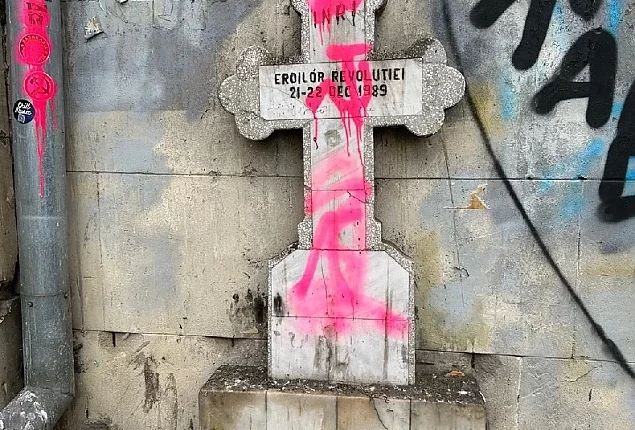 Crucea Eroilor Revoluției Române ridicată pe locul plin de sânge în 21-22 decembrie 1989, unde au murit tinerii protestatari anticomuniști, în dreptul Fântânii de la Facultatea de Arhitectură, Tricolorul pictat și Placa de marmură instalată în cinstea jertfei lor, au fost profanate prin vandalizare cu inscripții triviale și simbolul comunist secera și ciocanul.