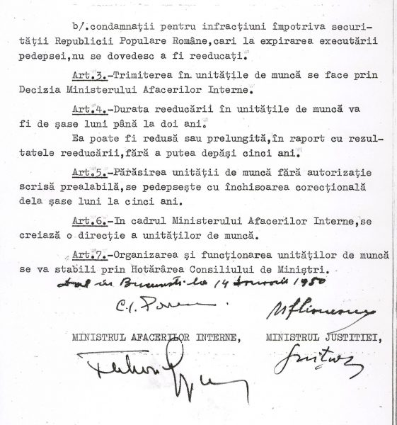 Un nou pas în oficializarea exterminării elitelor și opoziției din România l-a constituit Decretul nr. 6 din 14 ianuarie 1950, conform căruia se instituiau legal „unităţile de muncă”, de fapt lagărele de muncă forțată, destinate celor ce „primejduiesc sau încearcă să primejduiască regimul de democraţie populară”.