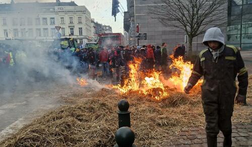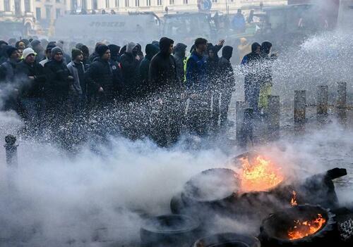 Fermierii au dat foc cauciucurilor și au blocat centrul orașului cu tractoarele, după cum arată filmările de la fața locului.