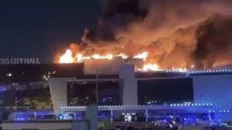 Rapoartele de presă ruseşti au declarat că atacatorii au folosit şi explozibili, provocând un incendiu masiv la Crocus, situată la marginea vestică a Moscovei. Un videoclip postat pe reţelele de socializare înfăţişa coloane uriaşe de fum negru ridicându-se deasupra clădirii.