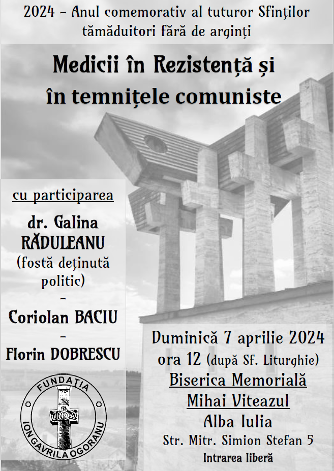 Vă invităm la evenimentul memorial „Medicii în Rezistență și în temnițele comuniste„, care se va desfășura Duminică 7 aprilie 2024, ora 12 (după Sf. Liturghie), la Biserica Memorială „Mihai Viteazul”, din Alba Iulia, Str. Mitropolit Simion Ștefan nr. 5.