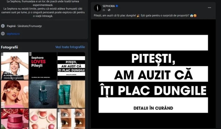 Pe 25 aprilie, Sephora România va deschide un magazin în noul mall din Pitești. Pentru a promova acest eveniment, Sephora a postat o fotografie cu dungi alb și negru și pe care stă scris: „Pitești, am auzit că îți plac dungile”.