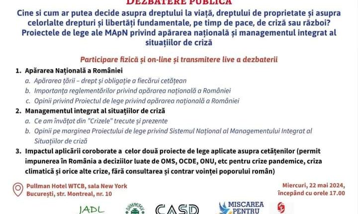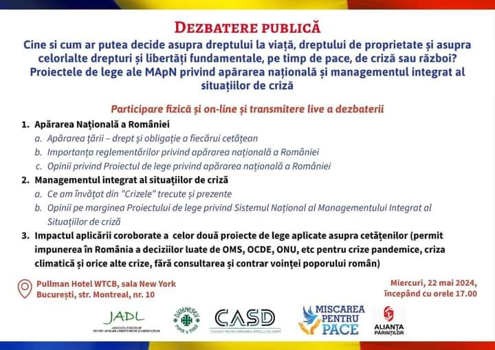 Noi, reprezentanți ai Societății cetățenești, vă transmitem prezenta invitație de a participa la dezbaterea publică cu tema „Cine și cum ar putea decide asupra dreptului la viață, dreptului de proprietate și asupra celorlalte drepturi și libertăți fundamentale, pe timp de pace, de criză, sau război? Proiectele de lege ale MApN privind Apărarea Națională și Managementul integrat al situațiilor de criză” ce va avea loc în data de: 22 mai 2024, începând cu orele 17.00, în incinta Pullman Hotel WTCB, sala New York,adresa: Piața Montreal, nr. 10, sector 1, București
